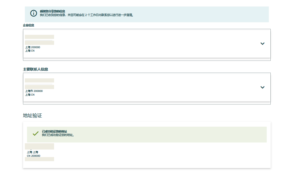 填写公司地址时请用中文填写实际经营地址,且精确到门牌号,确保是能够找到的准确地址,地址确认之后不能修改。确认无误后,您将在5-8个工作日内收到由亚马逊邮寄的包含地址验证码的明信片。接收到明信片后,请尽快将明信片上的验证码填写到地址验证栏。